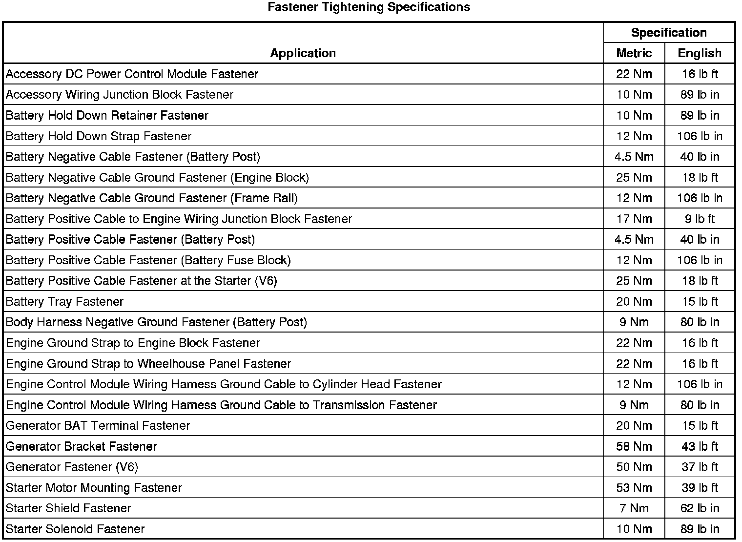 Fastener Tightening Specifications