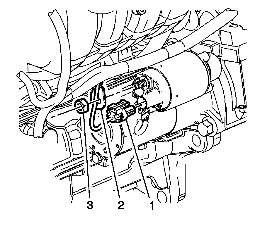 4. Remove the starter solenoid fastener (3) and the battery positive terminal (2) from the starter.