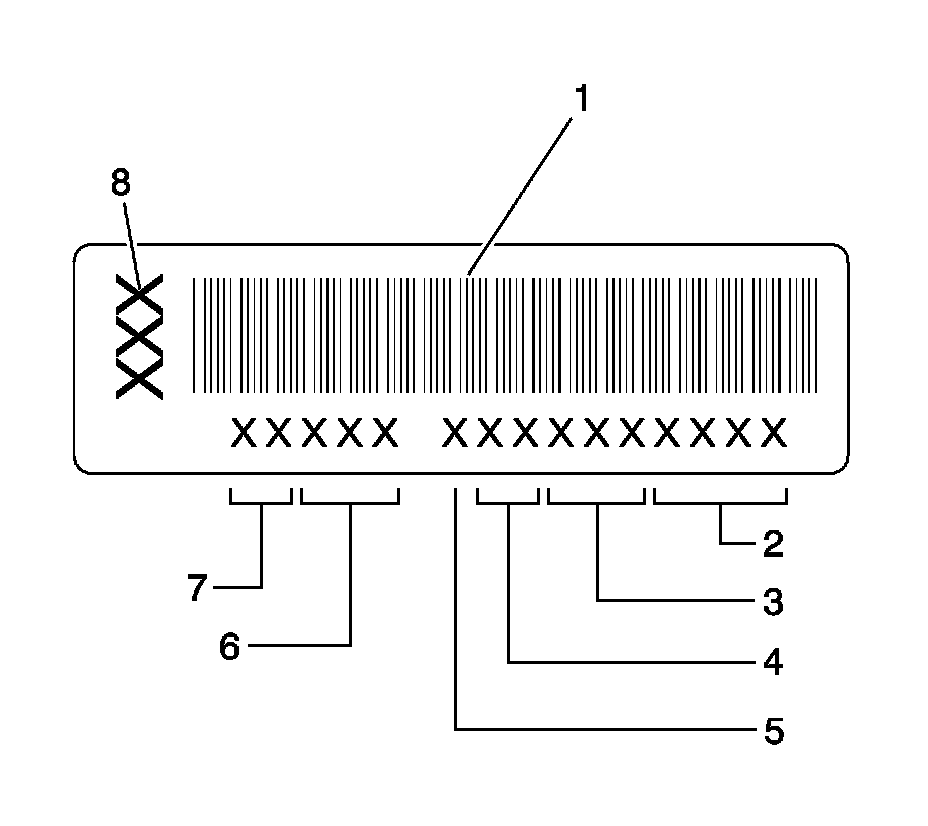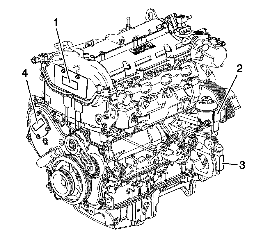 Identification can be made through the use of the broadcast code label (1), identification label (4), and the use of the partial vehicle identification number (VIN) etched in one of two places - the primary location is on the starter motor flange (3). The secondary location is the oil filter bowl (2).