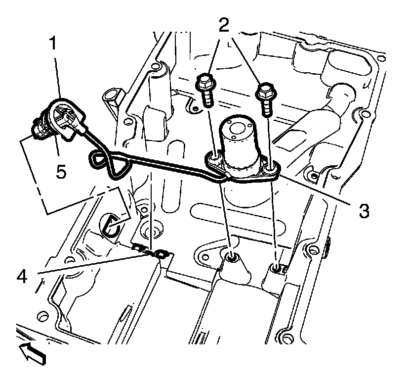 5. Remove the oil level sensor wiring harness plug (1) from the oil pan. Remove and DISCARD the seal ring (5).