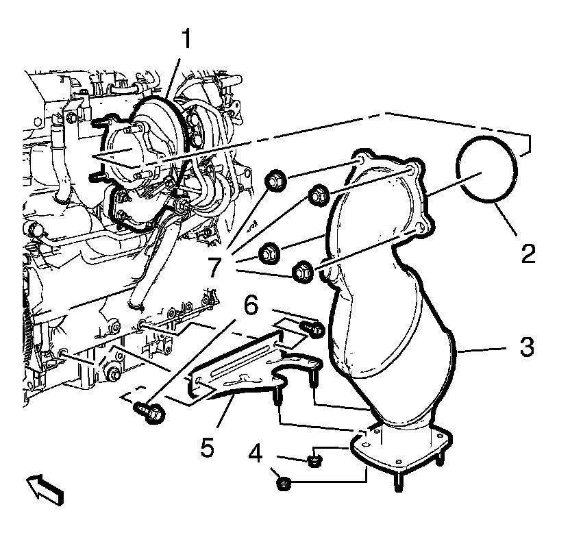 9. Remove the three way catalytic converter (3) along with the three way catalytic converter brace (5).