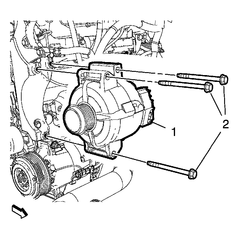 6. Install the 2 generator bolts (2) and tighten to 22 Nm (16 lb ft).