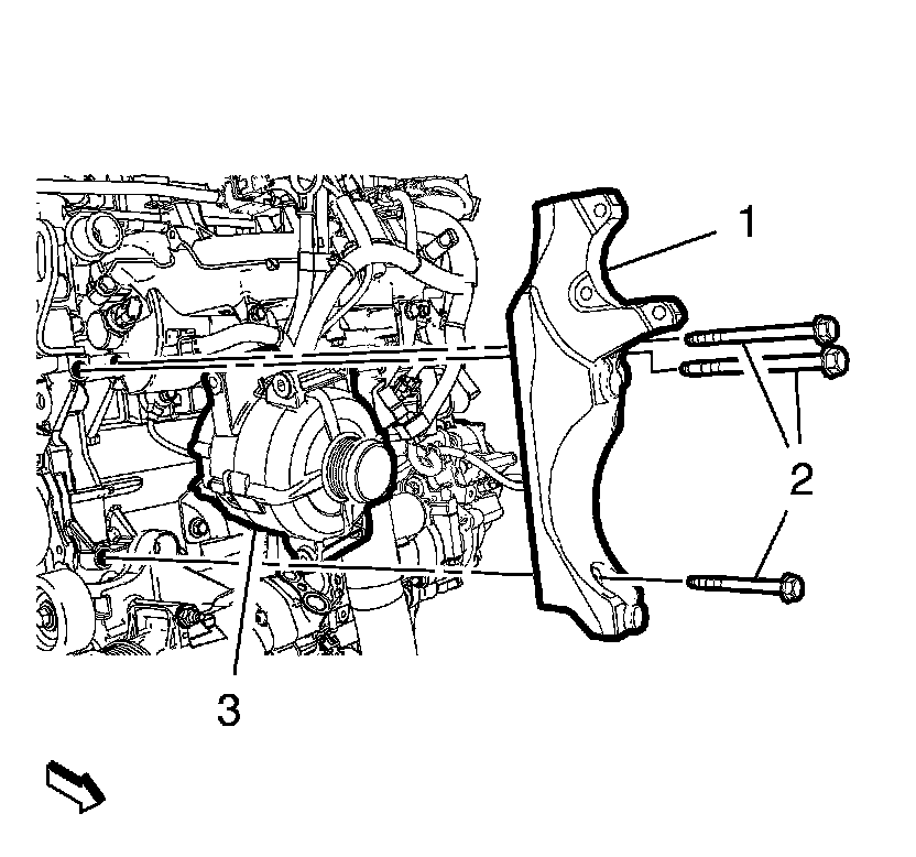 4. Install the 3 generator and power steering pump bracket bolts (2) and tighten to 22 Nm (16 lb ft).