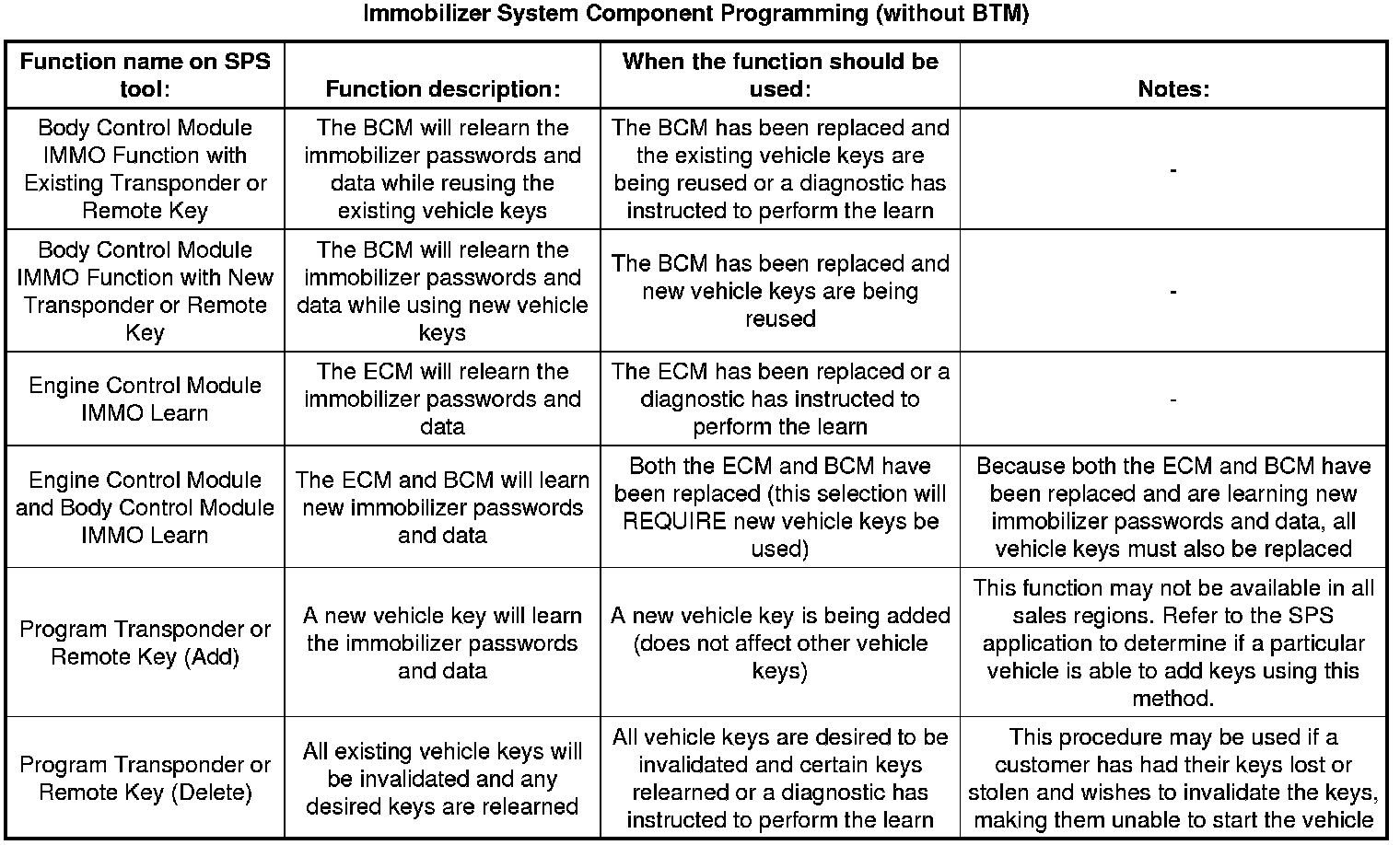 Depending on the immobilizer function being learned or the component replaced, different learn functions are required to be performed. These learn functions are as follows: