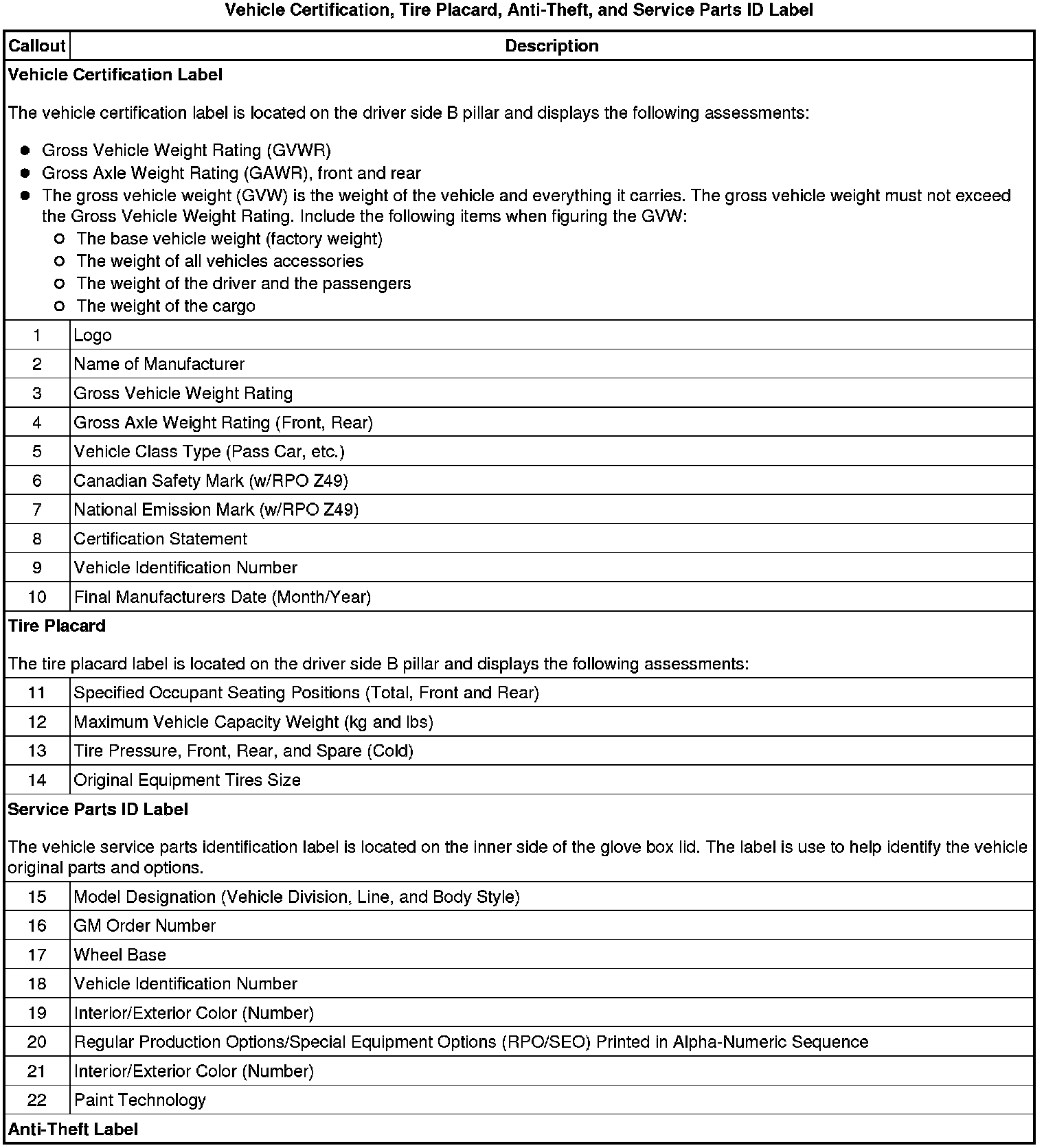 Vehicle Certification, Tire Placard, Anti-Theft, and Service Parts ID Label