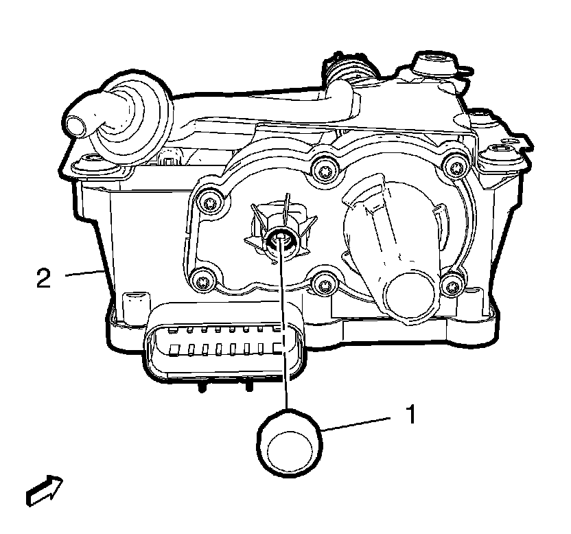 10. Should the electric parking brake release be inoperative, remove the rubber plug (1) from the rear of the electronic parking brake control module (2), and using a suitably-sized flat-head screwdriver release parking brake cable tension by turning the internal fitting fully clockwise to the stop.