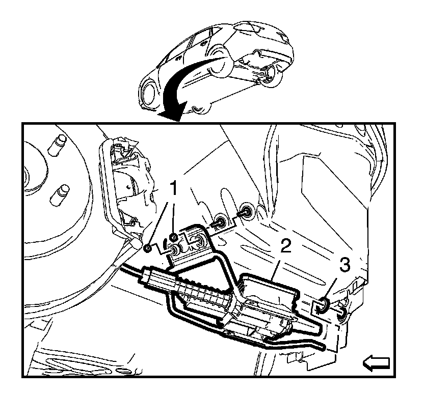 9. Remove the exhaust rear auxiliary muffler heat shield - left side. Refer to Exhaust Rear Auxiliary Muffler Heat Shield Replacement - Left Side Exhaust Rear Auxiliary Muffler Heat Shield Replacement - Left Side.
