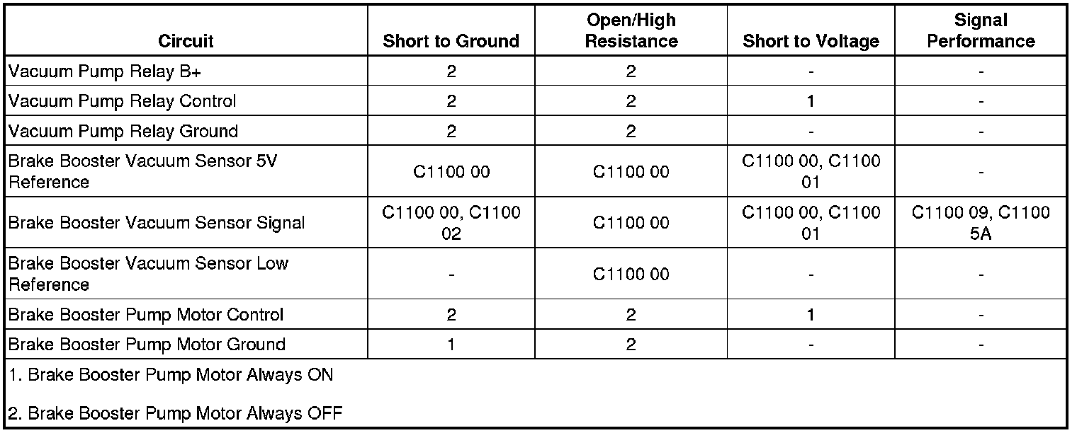 The brake booster vacuum sensor measures the vacuum in the brake booster assembly. The electronic brake control module supplies a 5 V reference and a low reference circuit to the brake booster vacuum sensor. The vacuum sensor supplies a voltage signal in relation to the pressure in the brake booster to the electronic brake control module. When the vacuum within the system becomes weak, the electronic brake control module turns ON the brake booster pump motor by providing battery voltage to the brake booster pump motor relay. The relay activates and supplies ground to the brake booster pump motor.