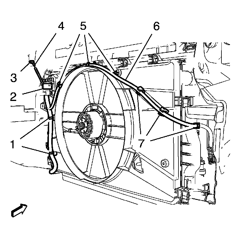 10. Unclip the engine coolant fan wiring harness (6) from the 7 wiring harness clips (1,5,7). Hang the engine coolant fan wiring harness aside.