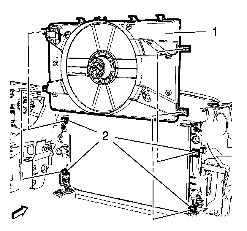 5. Clip the engine coolant fan shroud (1) to the 4 mounting points (2).