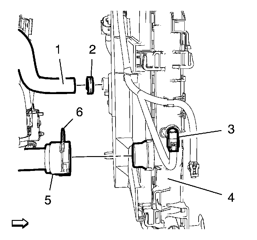 6. Remove the radiator inlet hose clamp (6) and the radiator outlet hose (5).