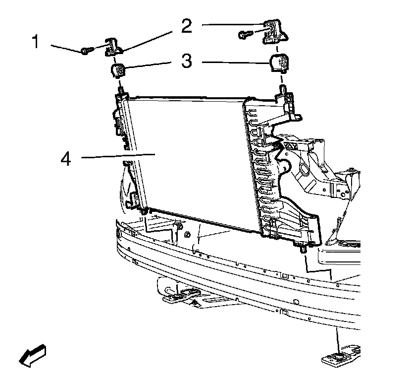 3. Install the 2 radiator upper brackets (2) and the 2 radiator upper bracket bolts (1) to the radiator (4) and tighten to 22 Nm (16 lb ft).