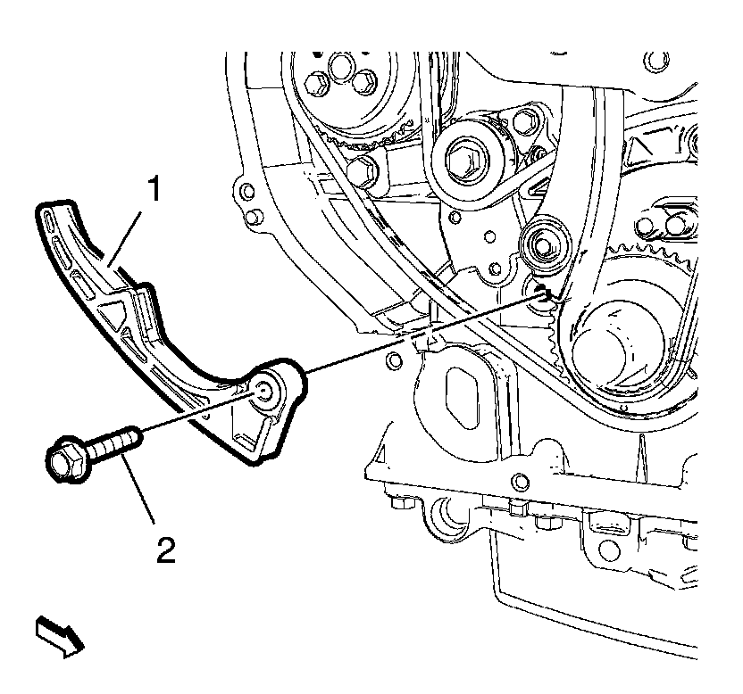 2. Remove the balancer chain guide bolt (2) and the balancer chain guide (1).