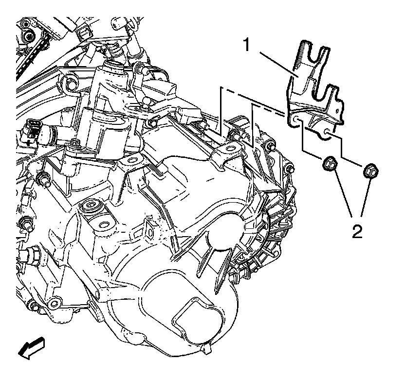 2. Install 2 shift lever and selector lever cable bracket nuts (2) and tighten to 20 Nm (15 lb ft).