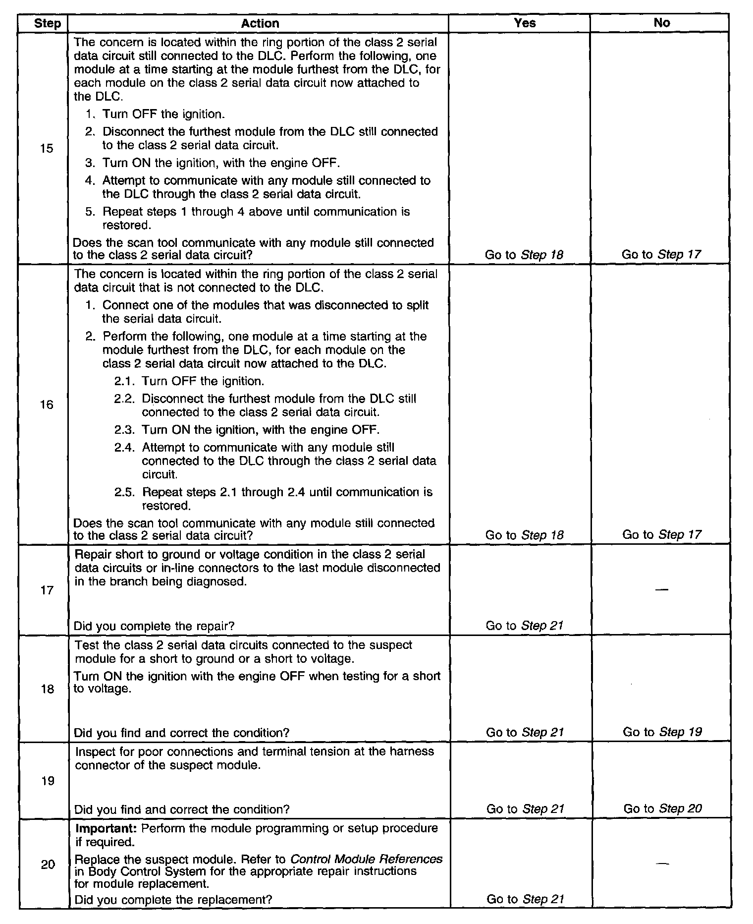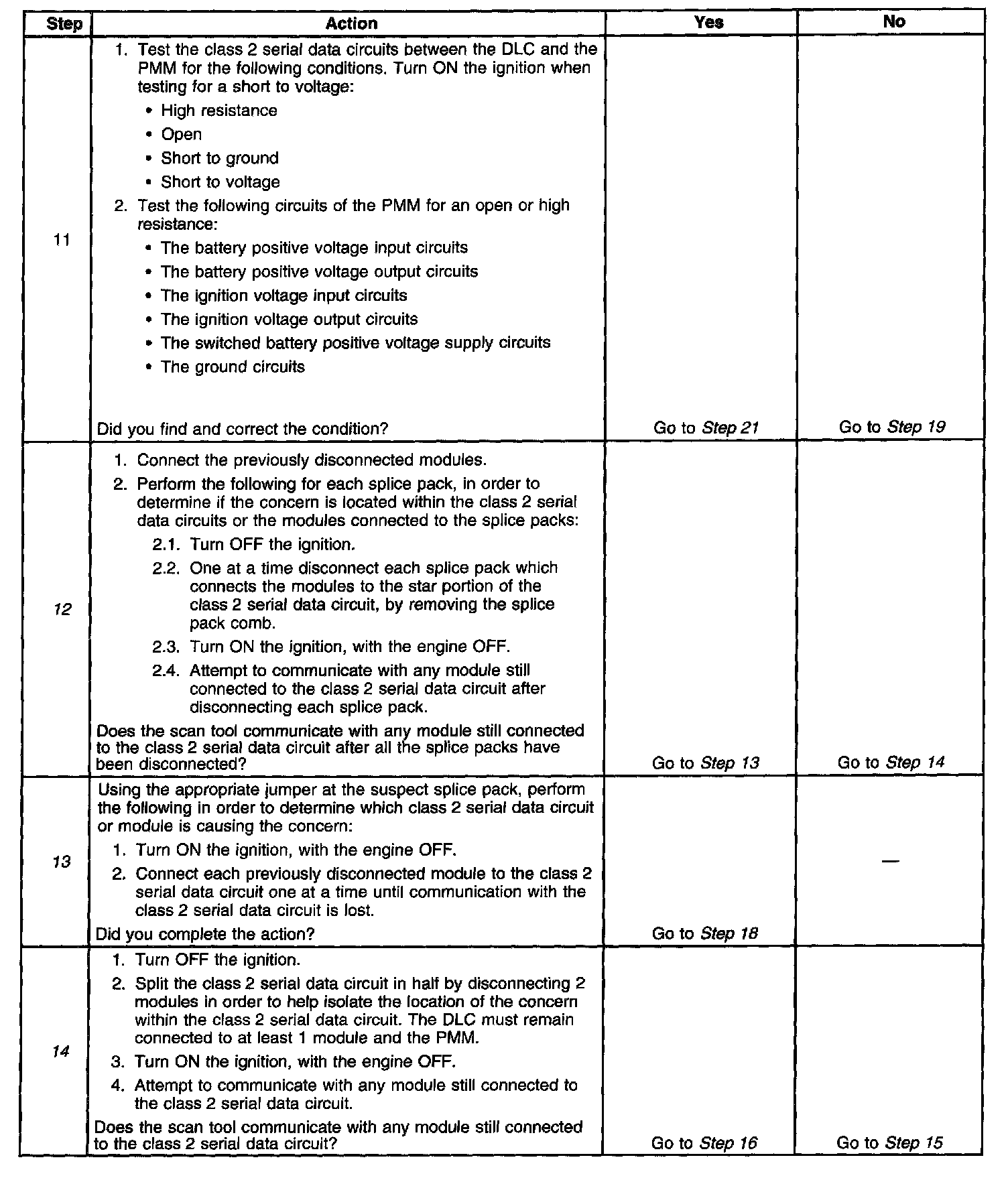 13. Connecting the class 2 serial data circuits to the suspect splice pack one at a time while attempting to communicate with any module still connected to the class 2 serial data circuit, will determine which circuit or module on the star is causing the concern.
