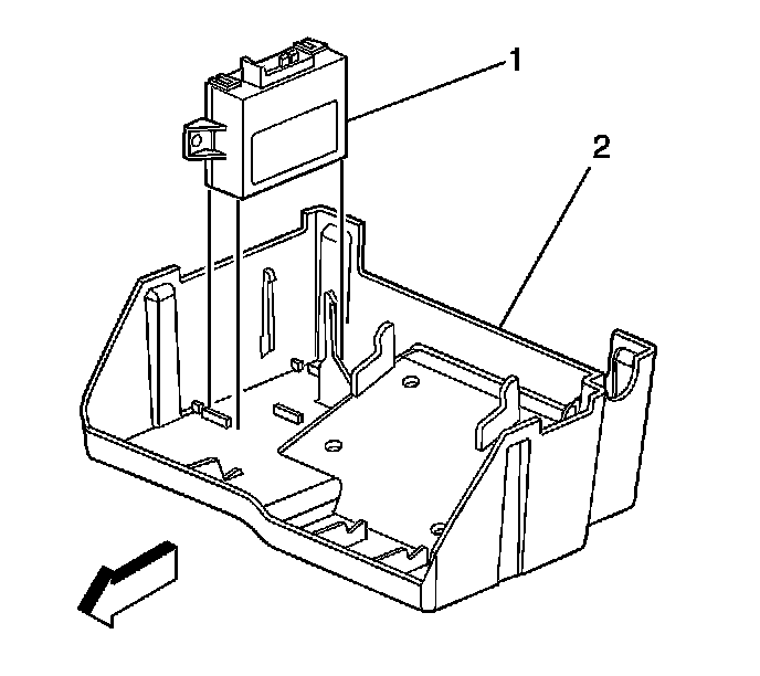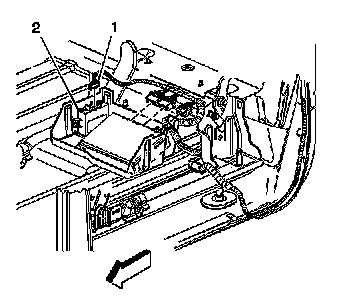 5. Disconnect the electrical connector (1) from the rear object alarm module (2).