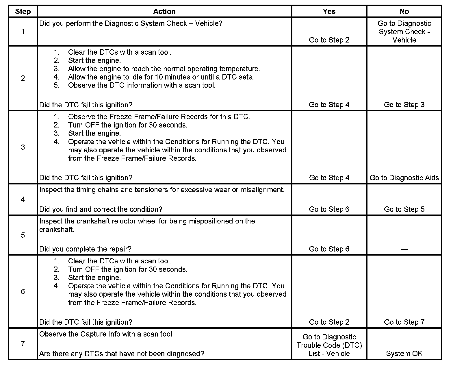 The engine control module (ECM) tests for a misalignment between both camshafts on one bank of the engine and the crankshaft. The misalignment would be at an idler sprocket for bank 2 or at the crankshaft. Once the ECM learns the position of both camshafts on one bank of the engine, the ECM compares the learned values to a reference value. If the ECM detects both learned values for one bank of the engine is exceeding a calibrated threshold in the same direction, this DTC sets.
