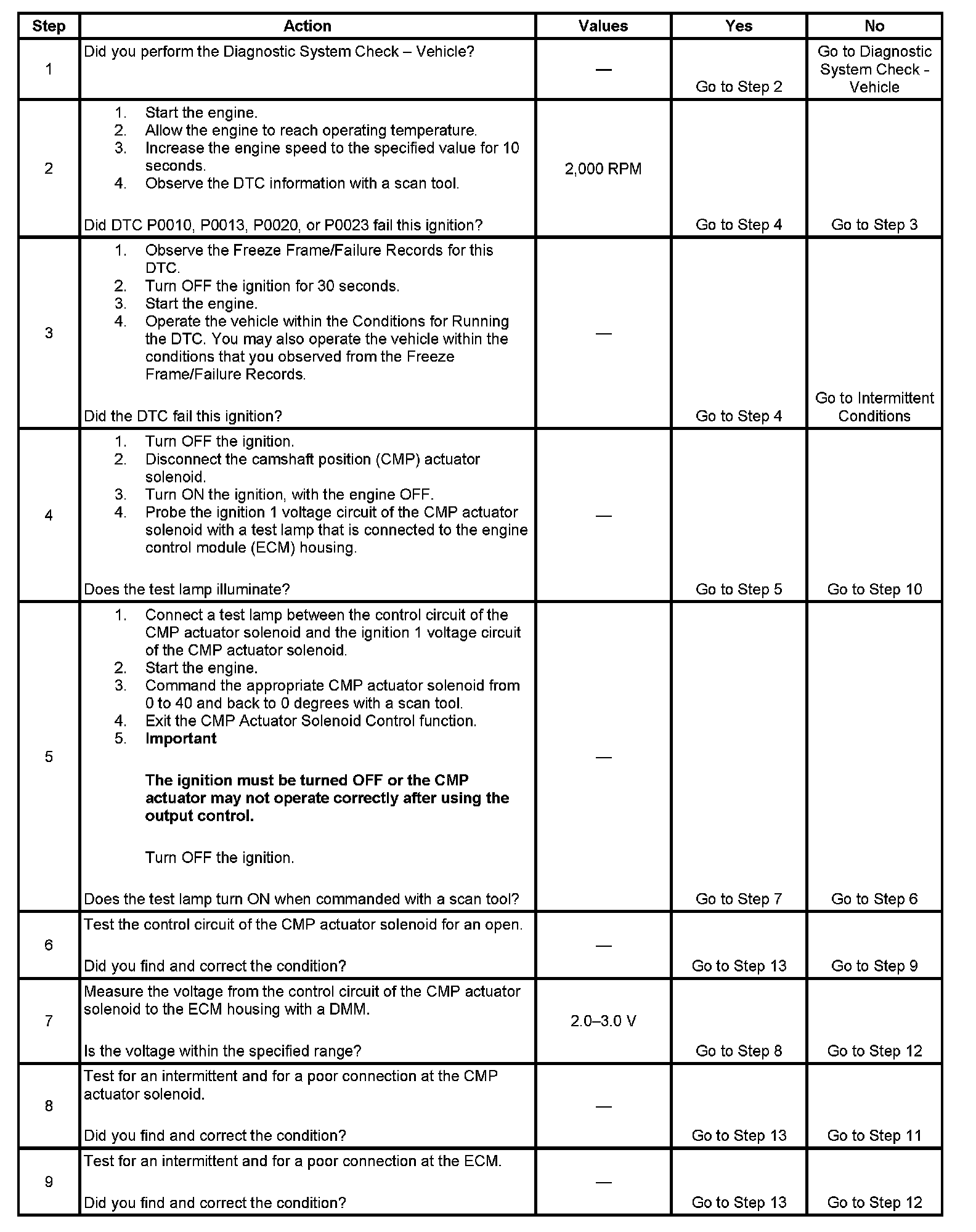 2. This step determines if the condition exists. The engine speed must be increased to enable the CMP actuator solenoids. The DTC will not set unless the solenoid is commanded ON and OFF at least once during the ignition cycle.