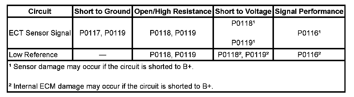 - A short to ground or voltage through a conductive material or fluid could set this DTC. Inspect the ECT sensor for evidence of coolant leaking into the connector body.