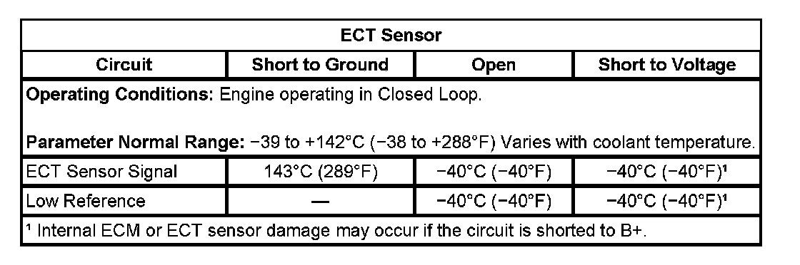 - If less than 143°C (289°F), test the signal circuit of the ECT sensor for a short to voltage or an open/high resistance. If the circuit/connections test normal, replace the ECM.