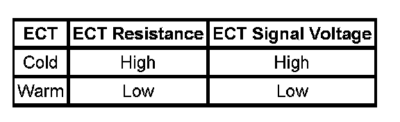 The engine coolant temperature (ECT) sensor is a variable resistor that measures the temperature of the engine coolant. The engine control module (ECM) supplies 5 volts to the ECT signal circuit and supplies a ground to the low reference circuit. If the ECM detects a low ECT signal voltage, which is a high temperature indication, this DTC sets.