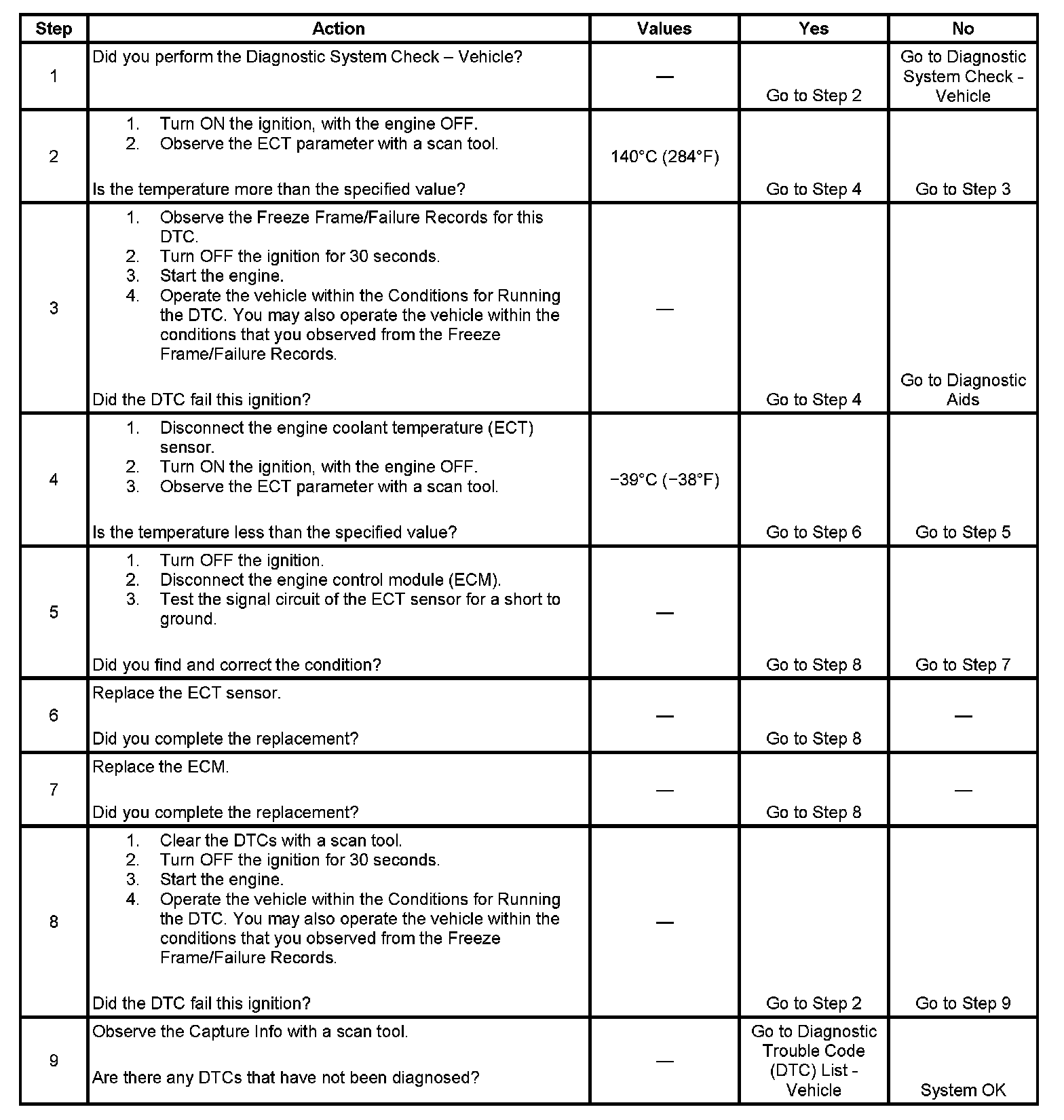 2. This step determines that a condition exists. If the temperature is more than the specified value, test for a condition in the circuits of the ECT sensor.