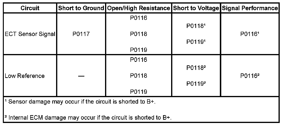 - High resistance on either the ECT sensor signal circuit or the ECT sensor low reference circuit could set a DTC.