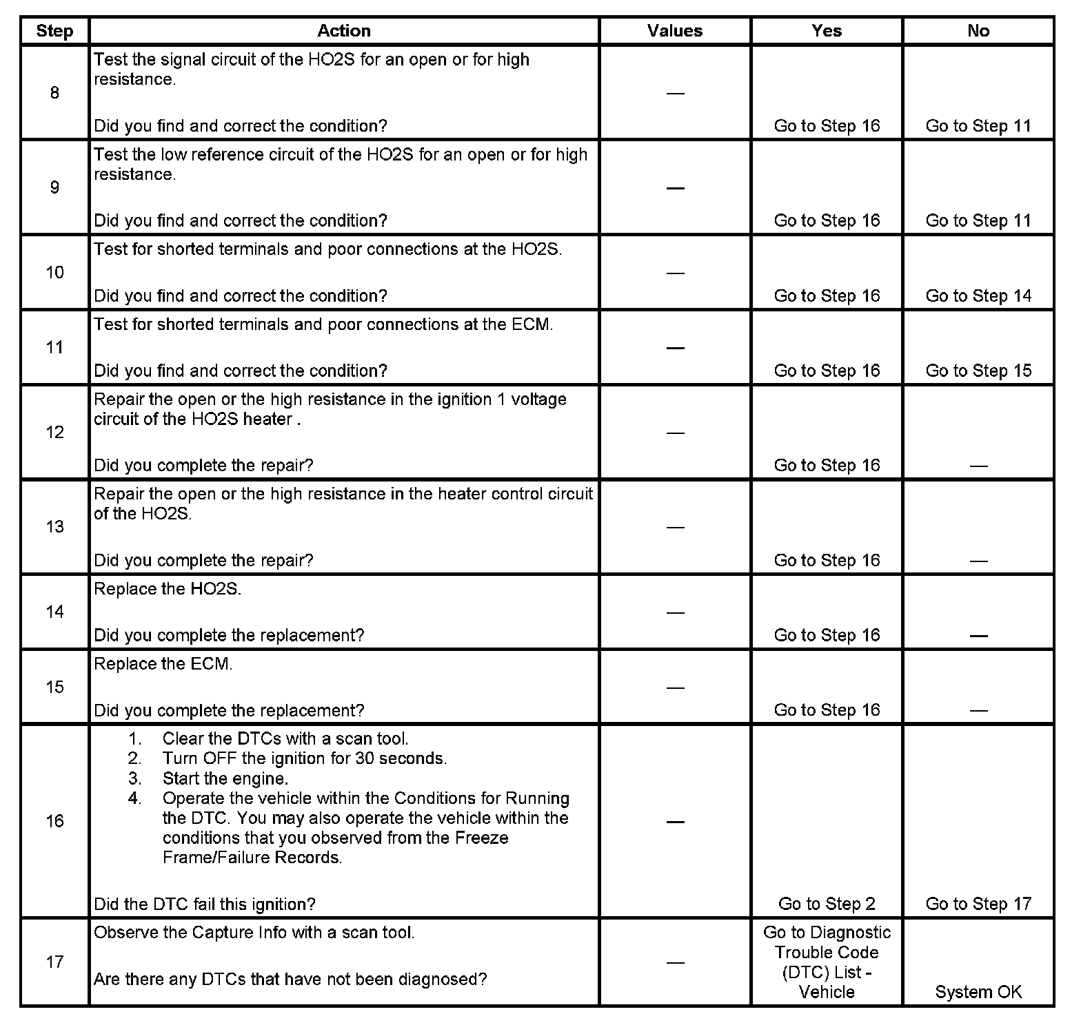 - DTCs P0137, P0138, P0140, P0157, P0158, or P0160 are not set.