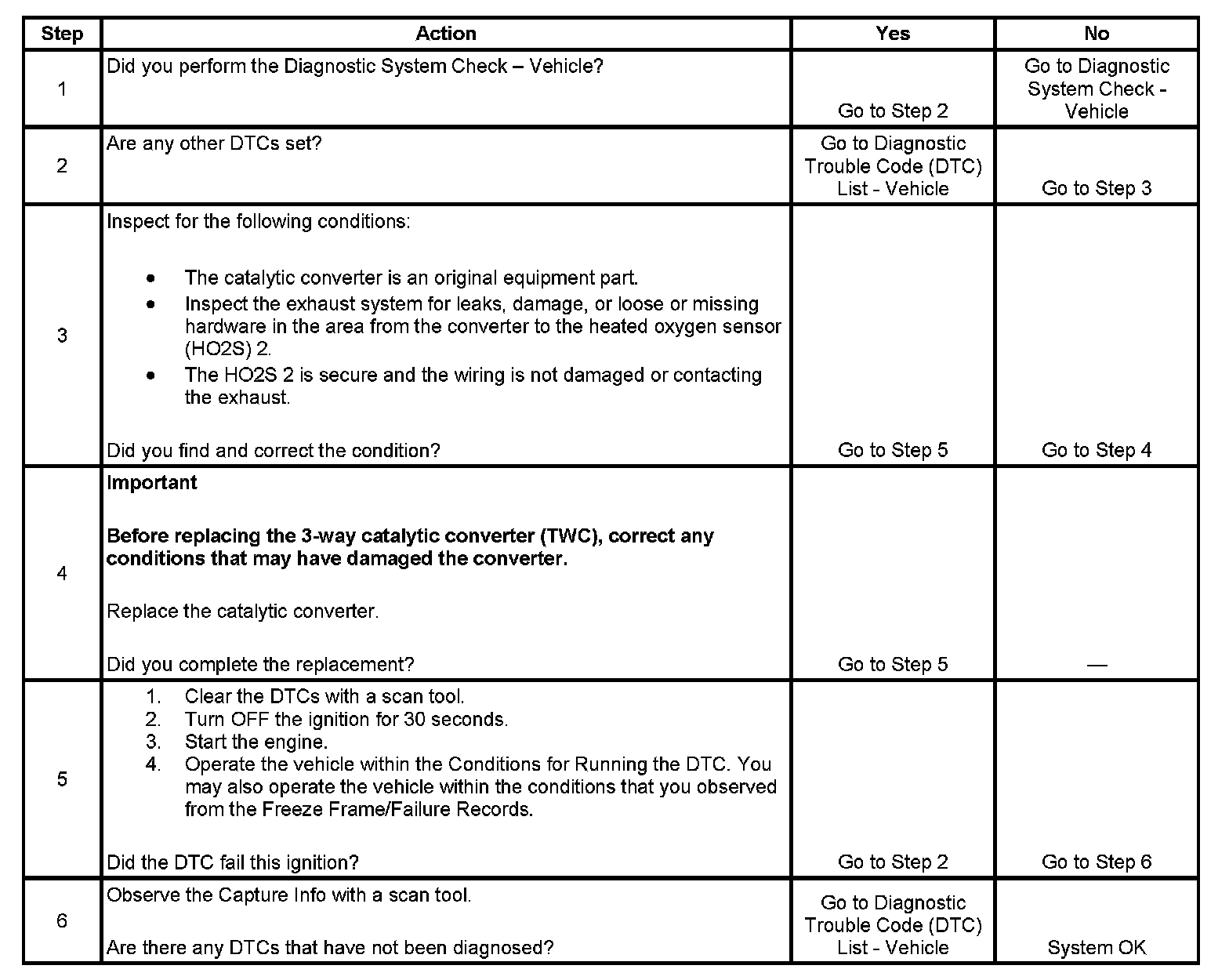 In order to maintain a reasonably low emission level of hydrocarbons (HC), carbon monoxide (CO), and oxides of nitrogen (NOx) a 3-way catalytic converter (TWC) is used. The catalyst within the converter promotes a chemical reaction that oxidizes the HC and CO present in the exhaust gas. This reaction converts the gases into harmless water vapor and carbon dioxide. The catalyst also reduces the NOx, converting the NOx into nitrogen. The engine control module (ECM) monitors this process using the post catalyst heated oxygen sensor (HO2S) signal. The post-catalyst HO2S located in the exhaust stream after the TWC, produces an output signal that indicates the oxygen storage capacity of the catalyst. The oxygen storage capacity (OSC) determines the ability of the catalyst to convert the exhaust emissions effectively. If the catalyst is functioning correctly, the post-catalyst HO2S signal will be far less active than the signal produced by the pre-catalyst HO2S.
