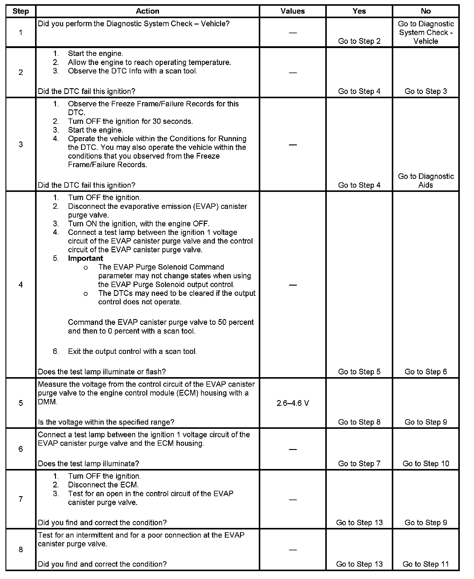 - The ECM detects the voltage on the EVAP canister purge valve control circuit is between 2.6-4.6 volts when the driver is commanded OFF.