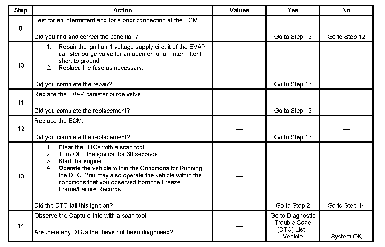 The numbers below refer to the step numbers on the diagnostic table.