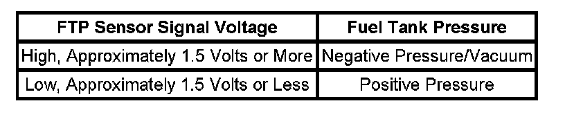 The table illustrates the relationship between FTP sensor signal voltage and the EVAP system pressure/vacuum.