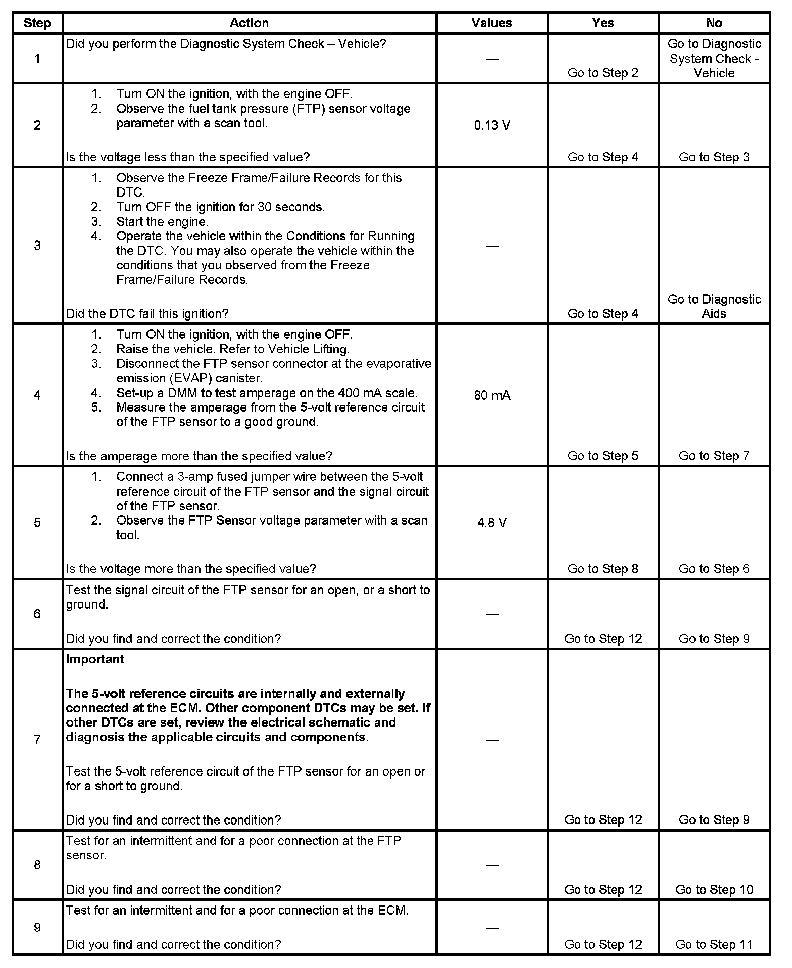 The evaporative emission (EVAP) system is used to store fuel vapors in order to reduce the amount of fuel vapors into the atmosphere. The fuel tank pressure (FTP) sensor is only used for EVAP system diagnostics. The FTP sensor is a transducer that varies resistance according to changes in the fuel tank pressure. The engine control module (ECM) monitors the FTP sensor signal in order to detect vacuum decay and excess vacuum during the EVAP system diagnostic test. The ECM supplies a 5-Volt reference and a low reference circuit to the FTP sensor. If the ECM detects that the FTP sensor signal voltage is too low, this DTC sets.