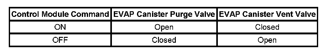 The table illustrates the relationship between the ON and OFF states, and the OPEN or CLOSED states of the EVAP canister purge and vent valves.
