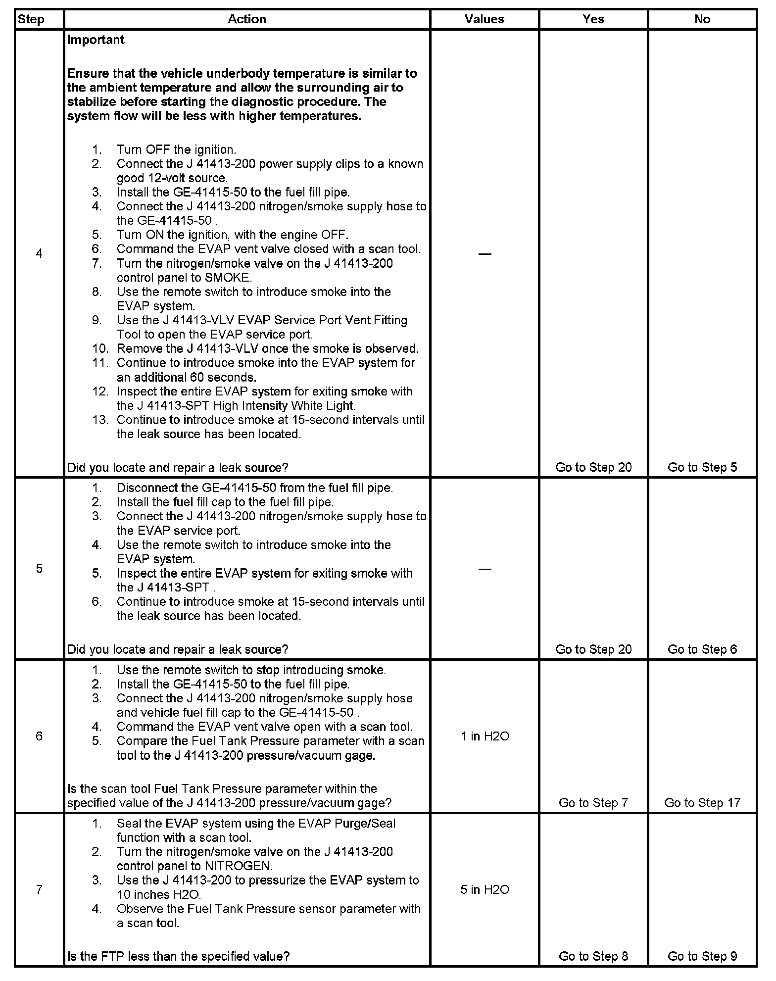 8. This step tests for a obstruction between the fuel tank and the FTP sensor, which is mounted on the EVAP canister, or a failed FTP sensor. Replace the FTP sensor if the pressure on the J 41413-200 gage drops to near 0 inches H2O, with the sensor removed from the canister.