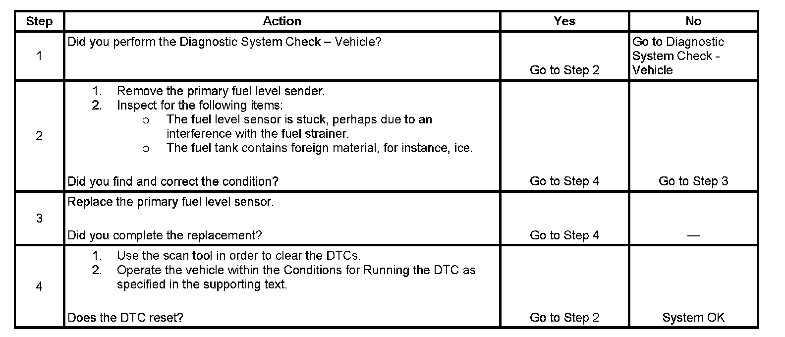 This diagnostic tests for the primary fuel level sensor signal movement. The ECM sets this DTC when it detects a difference between engine consumed fuel and change of the fuel level signal of the primary fuel level sensor.