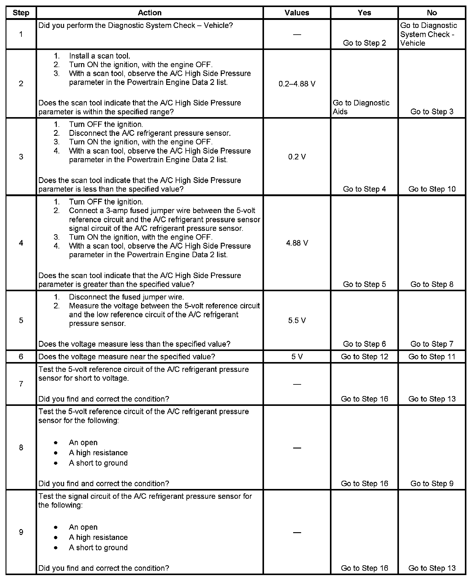The numbers below refer to the step numbers on the diagnostic table.