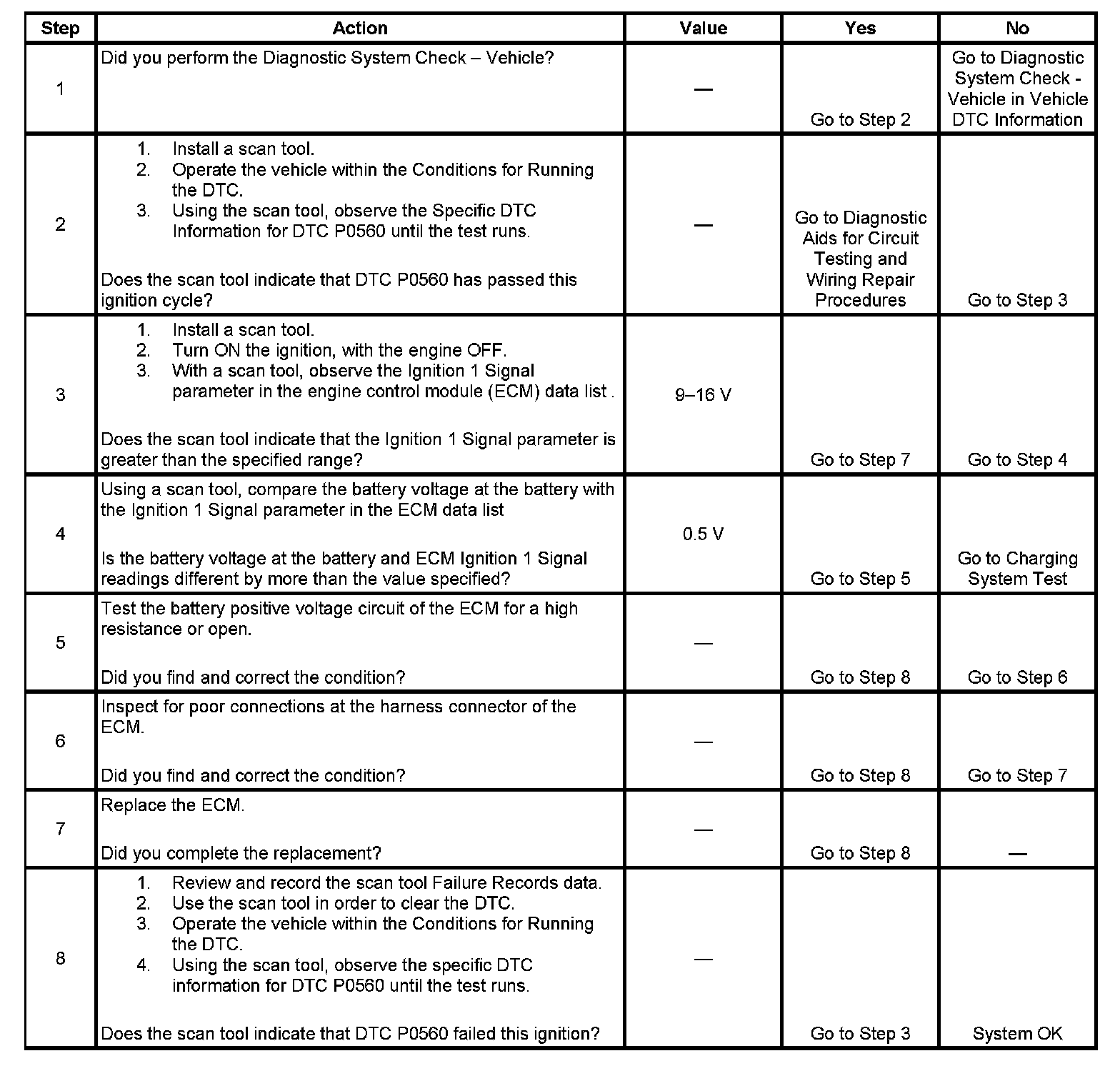 The engine control module (ECM) monitors the system voltage to make sure that the voltage stays within the proper range. Damage to components, and incorrect data input can occur when the voltage is out of range. The ECM monitors the system voltage over an extended length of time. If the ECM detects a system voltage outside an expected range for the calibrated length of time, DTC P0560 will set.