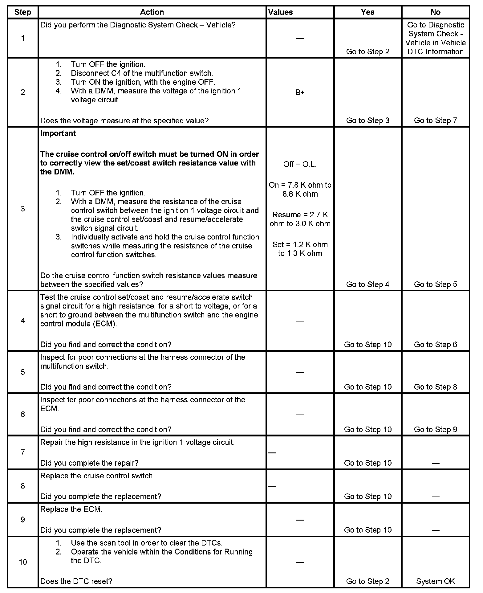 This DTC sets when the ECM detects an invalid voltage signal on the cruise control set/coast and resume/accelerate switch signal circuit for greater than 1.5 seconds.