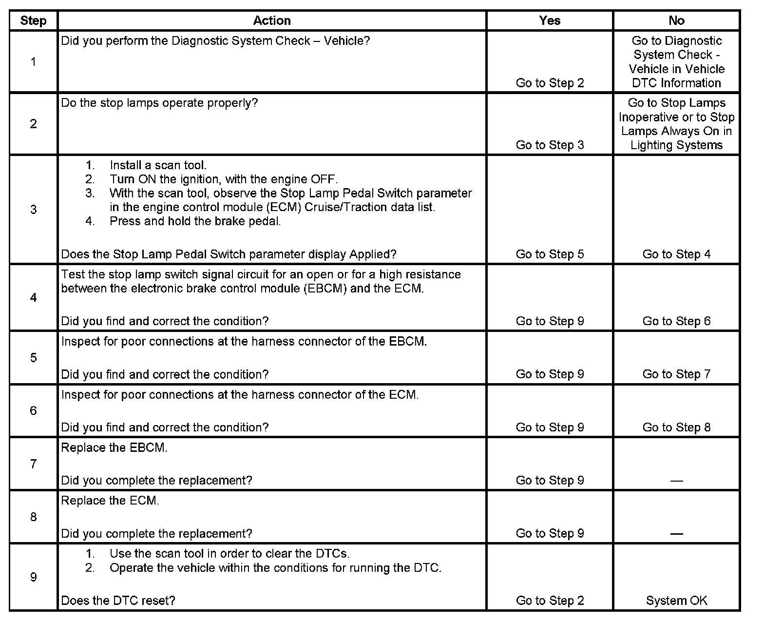 - The ECM detects that the class 2 serial data message and the voltage signal on the stop lamp switch signal circuit do not match for 10 consecutive times that this diagnostic is run.