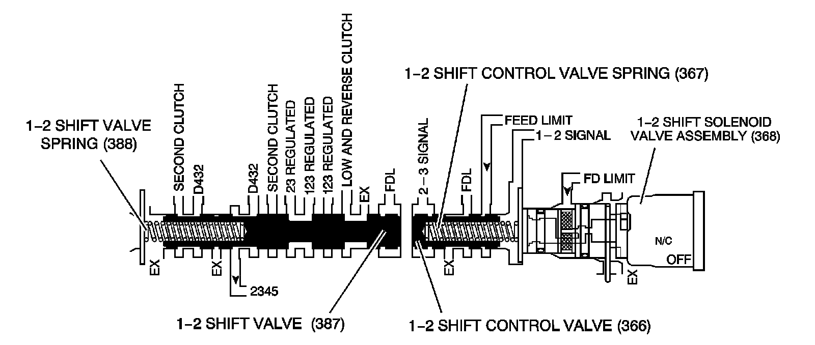 The 1-2 shift solenoid (SS) valve is a normally-closed exhaust valve that, in conjunction with the 2-3 shift solenoid (SS) valve, allows 4 different shifting combinations. The 1-2 SS valve is attached to the control valve body, within the transmission.