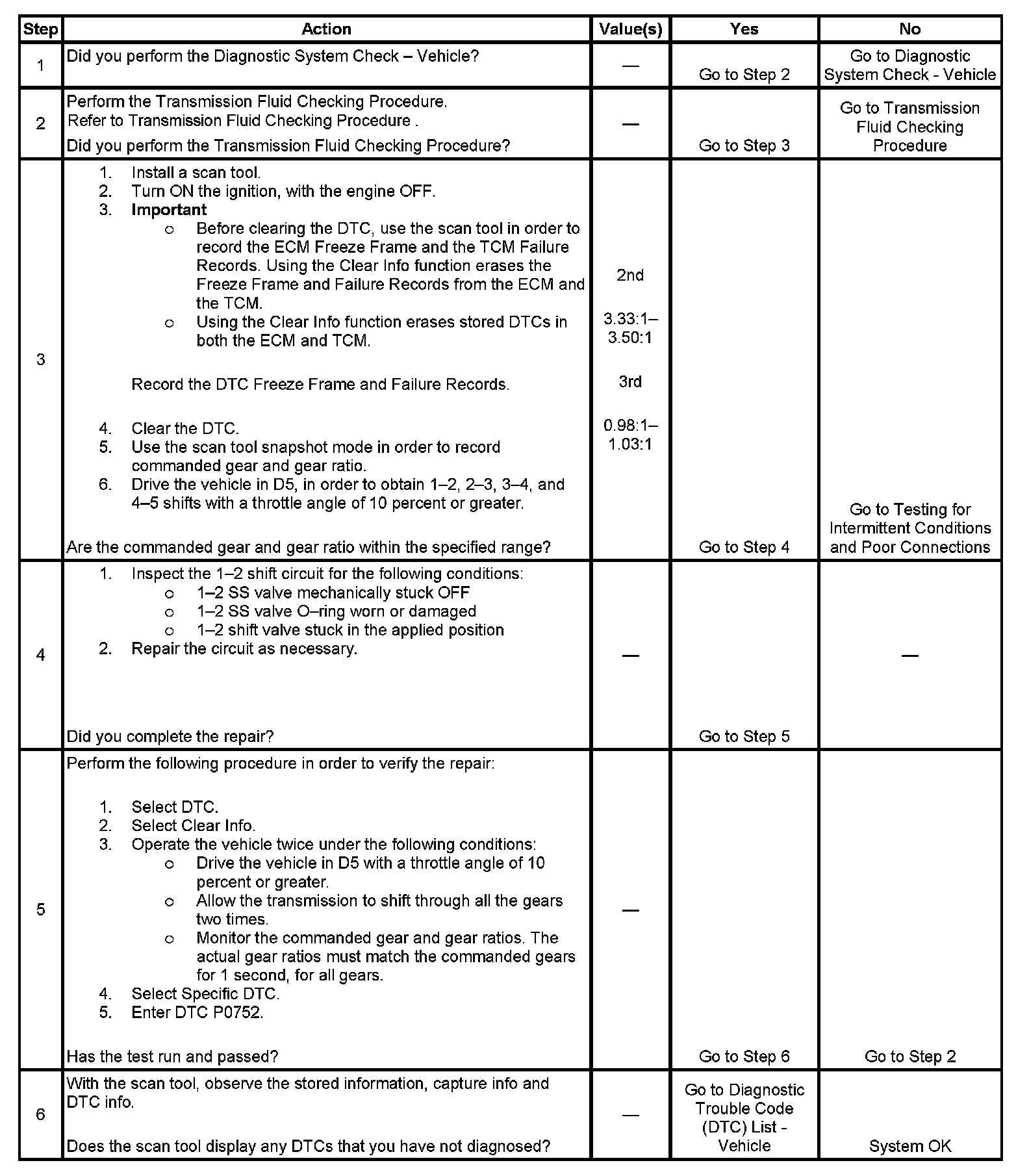 If the TCM detects a 1-1-4-4-5 shift pattern, then DTC P0752 sets. DTC P0752 is a type B DTC.