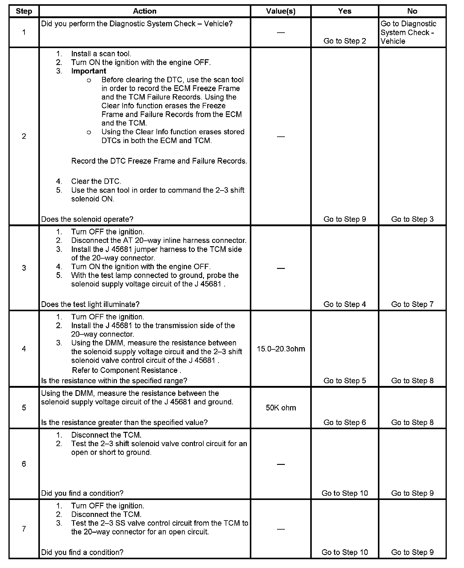 The TCM provides voltage to the solenoid through high side driver 2 (HSD2). The TCM uses a second driver to control the solenoid ground circuit. The controlled ground driver reports feedback voltage to the TCM. When the TCM commands the 2-3 shift solenoid valve ON, the voltage of the control circuit should be approximately 0 volts. When the TCM commands the 2-3 shift solenoid valve OFF, the voltage of the control circuit should be approximately system voltage.