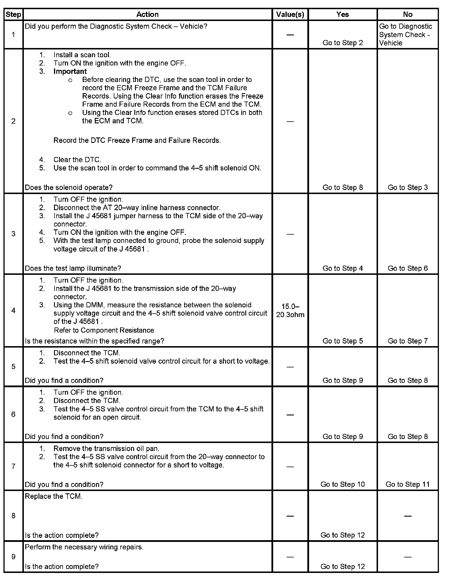 The TCM provides voltage to the solenoid through high side driver 2 (HSD2). The TCM uses a second driver to control the solenoid ground circuit. The controlled ground driver reports feedback voltage to the TCM. When the TCM commands the 4-5 shift solenoid valve ON, the voltage of the control circuit should be approximately 0 volts. When the TCM commands the 4-5 shift solenoid valve OFF, the voltage of the control circuit should be approximately system voltage.