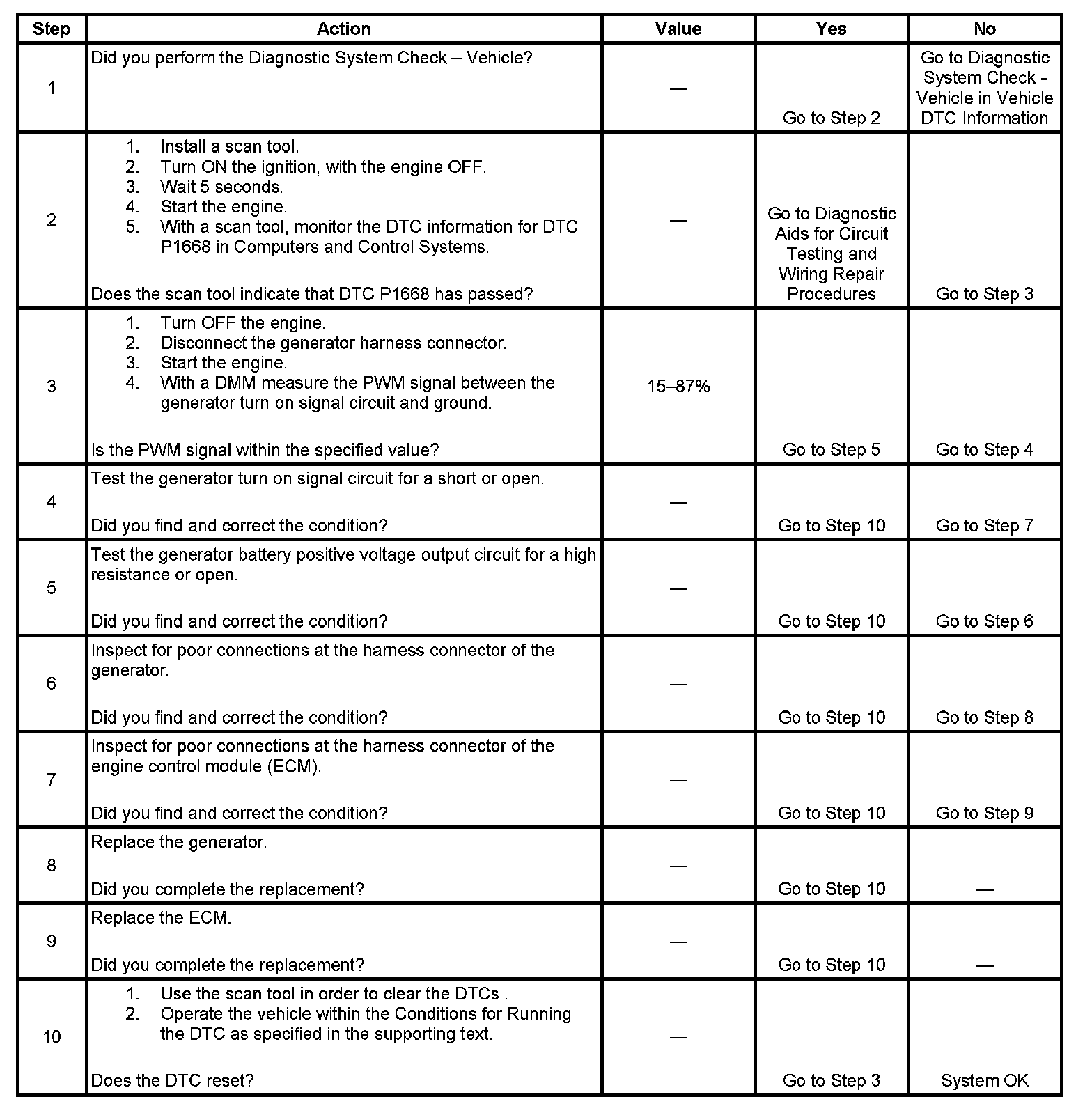 The engine control module (ECM) uses the generator turn-on signal circuit to control the voltage output of the generator. When a different voltage is desired, the ECM will change the pulse width modulation (PWM) signal to the voltage regulator via the generator turn-on signal circuit. This causes the voltage regulator to the voltage output of the generator. The ECM has fault detection circuitry which monitors the state of the generator turn-on signal circuit. If the fault detection circuit senses a voltage other than what is expected, this DTC will set. The voltage regulator also contains fault detection circuitry. If the regulator detects a problem, the regulator will ground the generator turn-on signal circuit, pulling the voltage low. This also causes the ECM to set the DTC.