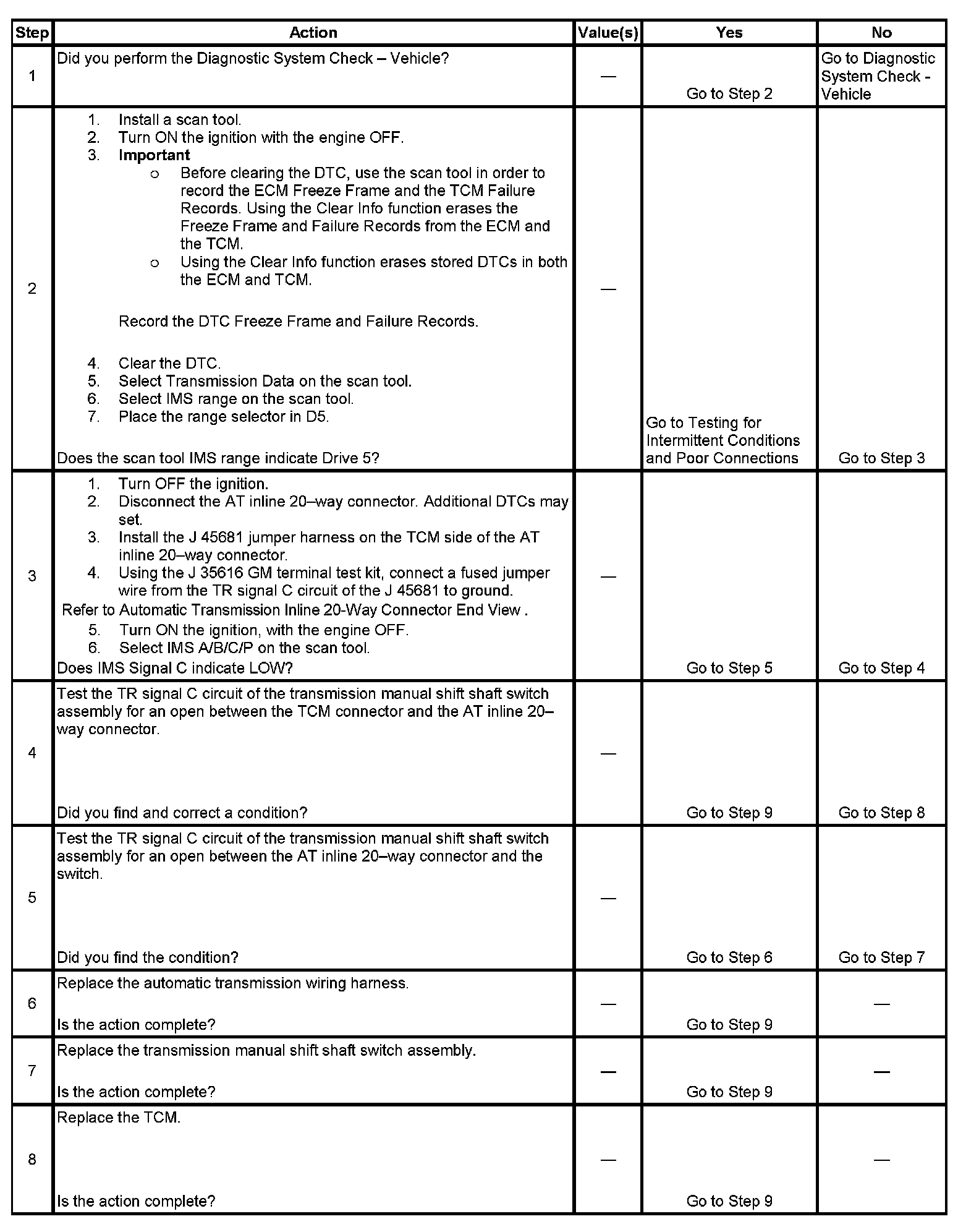 The transmission manual shift shaft switch assembly is a sliding contact switch attached to the control valve body within the transmission. The four inputs to the transmission control module (TCM) from the switch indicate which position is selected by the transmission selector lever. This information is used for engine controls as well as determining the transmission shift patterns. The input voltage level at the TCM is high when the switch is open and low when the switch is closed to ground. The state of each input is displayed on the scan tool as IMS. The four IMS input parameters represented are Signal A, Signal B, Signal C and Signal P.