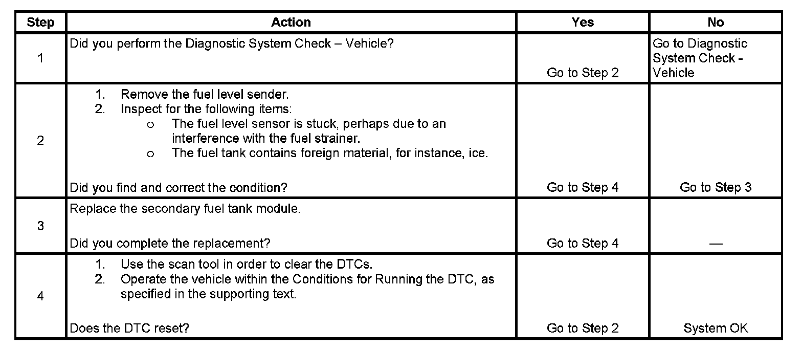 This diagnostic tests for the secondary fuel level sensor signal movement. The ECM sets this DTC when it detects a difference between engine consumed fuel and change of the fuel level signal of the secondary fuel level sensor.