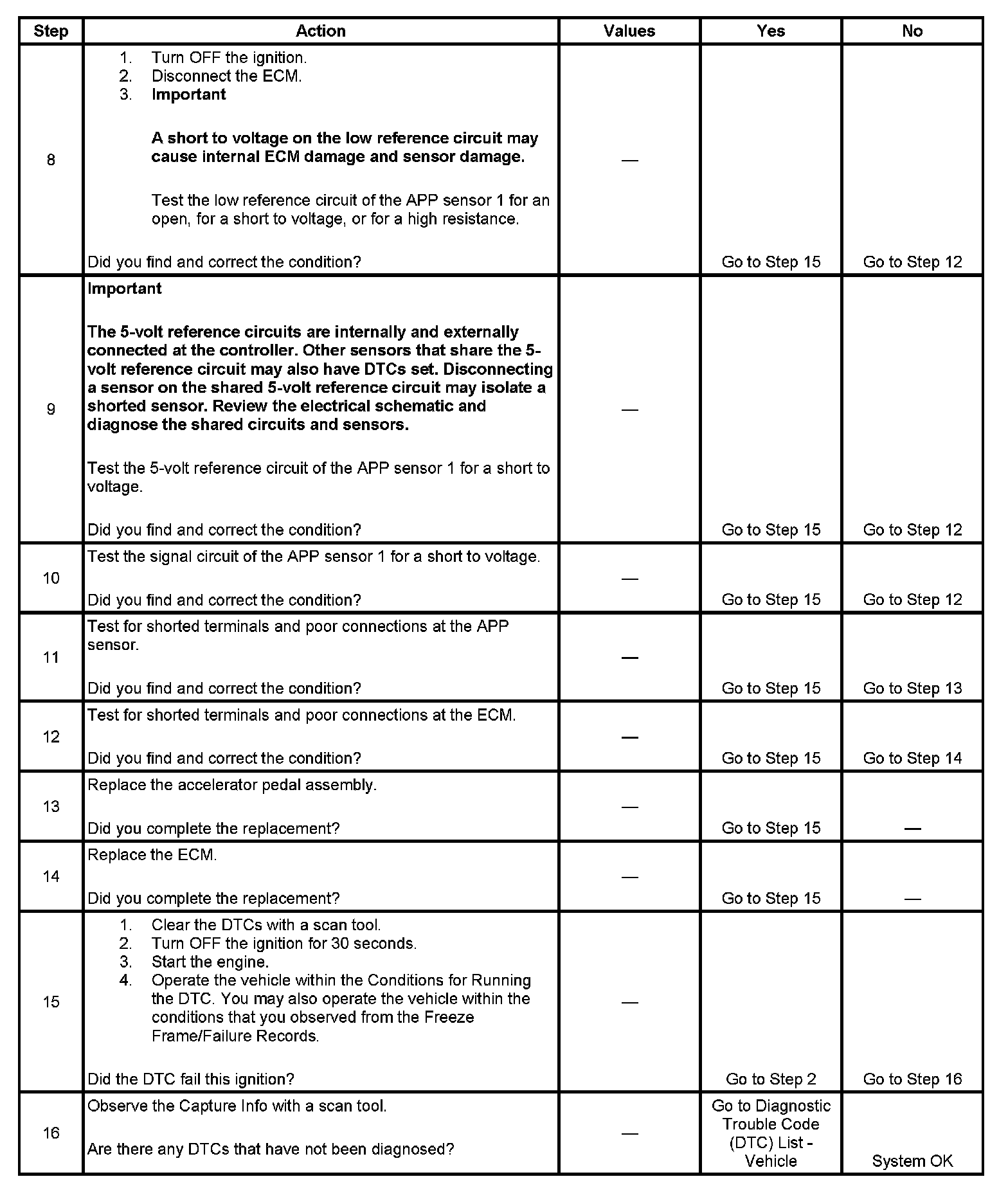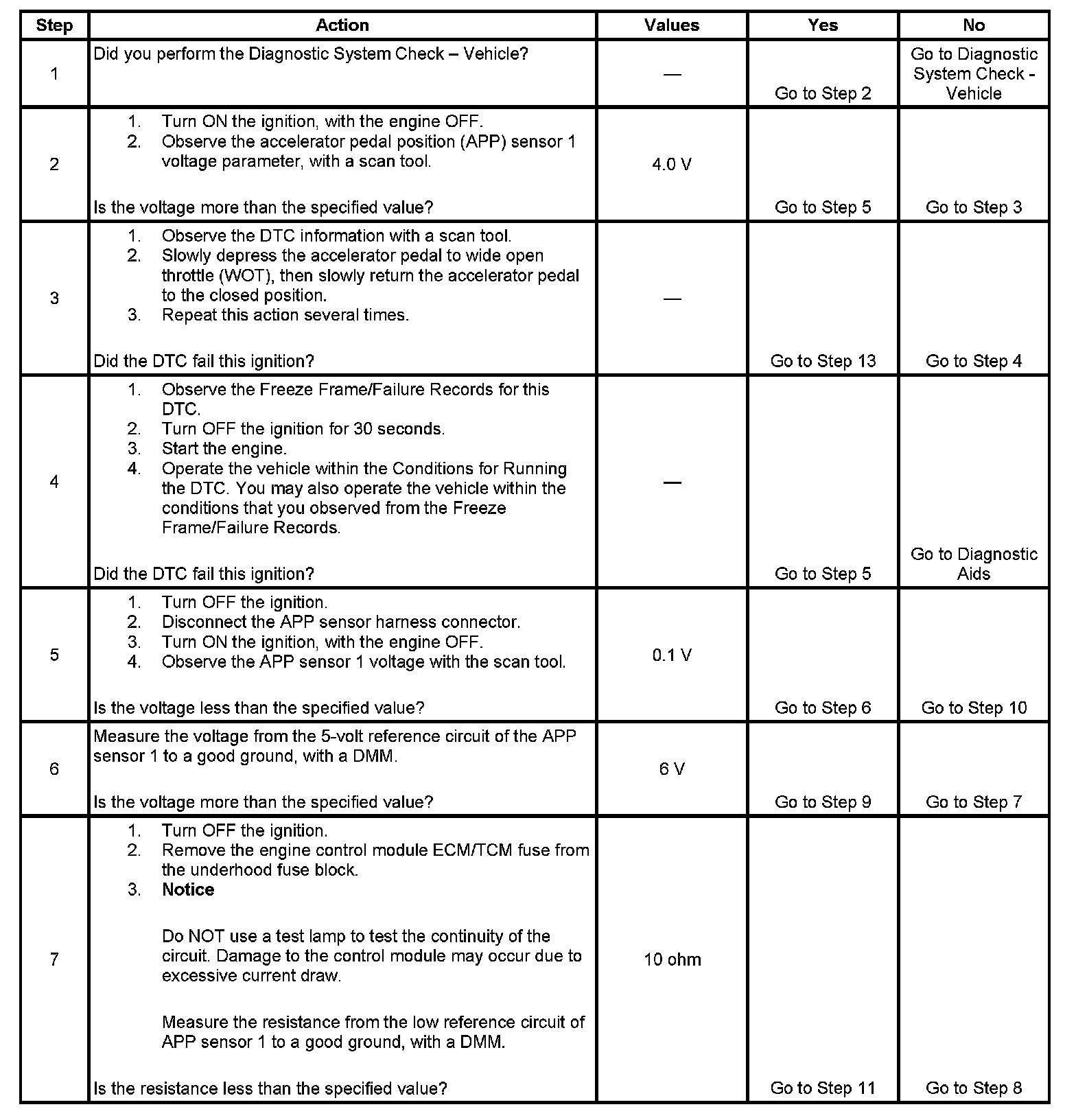 3. This step tests the internal circuits of the APP sensor 1 throughout its range of motion. If this DTC sets when slowly moving the pedal from the rest position to wide open throttle (WOT), replace the APP assembly for an internal fault.