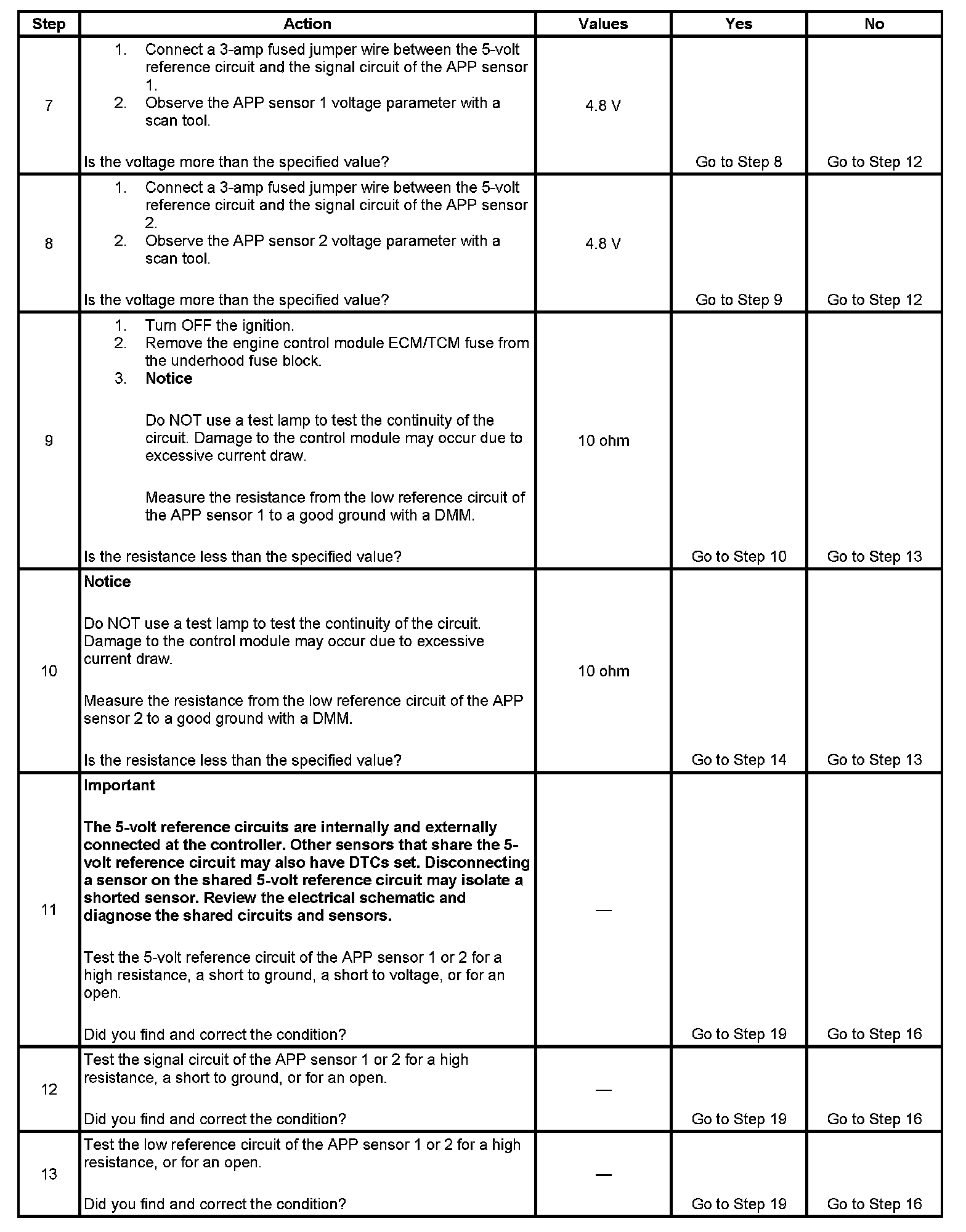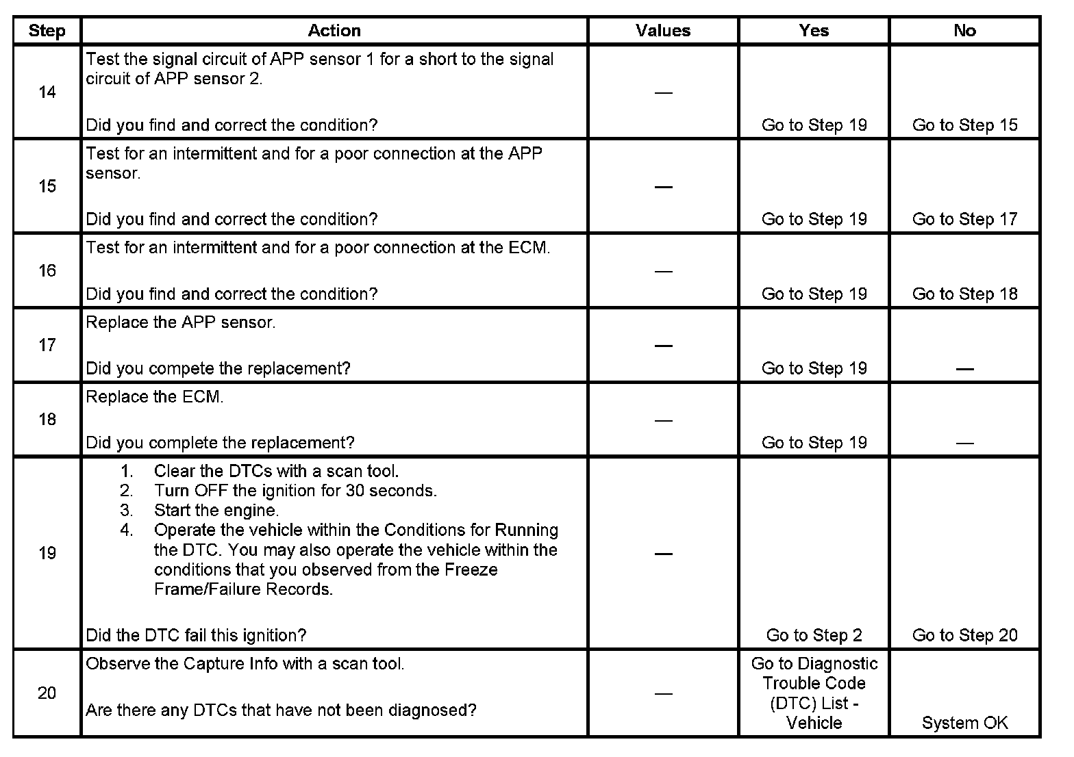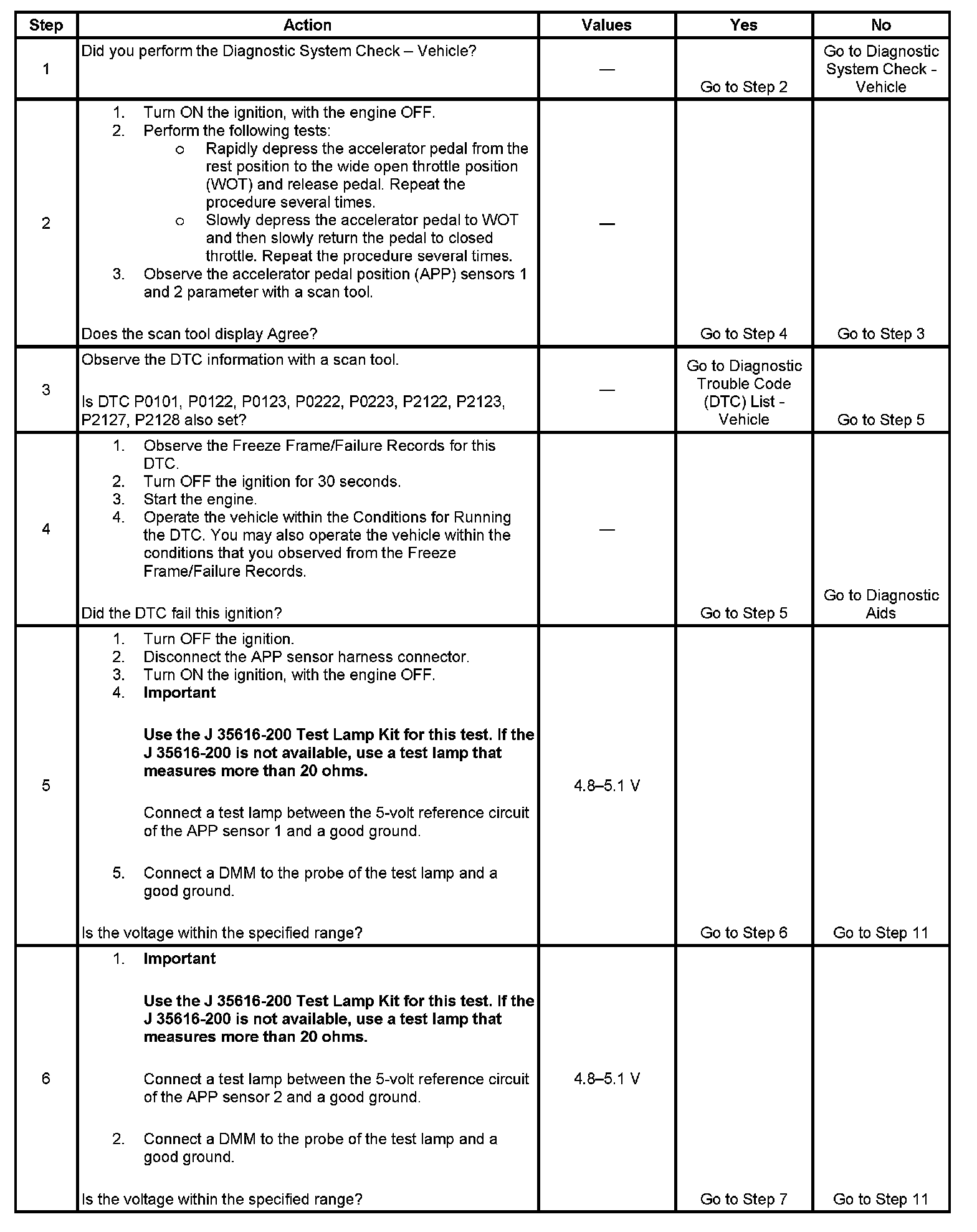 - If DTCs P0700, P2122, P2128, and P2138 are set together in various combinations, inspect the APP sensor 1 and 2 signal circuits for being shorted together.