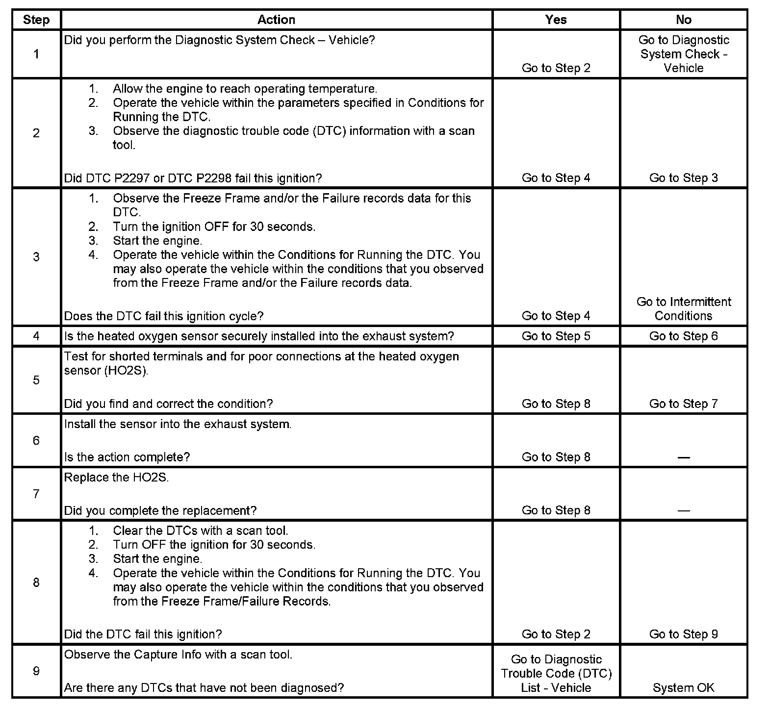- Before the ECM can report DTC P2297 or P2298 failed, DTCs P0030, P0031, P0050, P0051, P0052, P0130, P0131, P0132, P0150, P0151, P0152, P2237, P2240, P2243, P2247, P2251, and P2254 must run and pass.